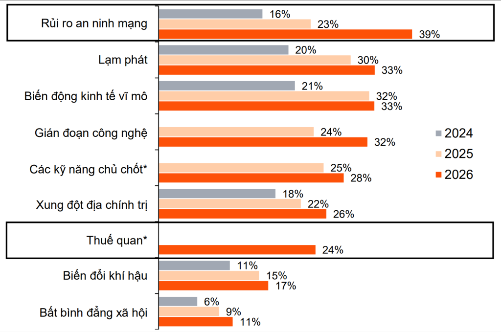 39% CEO đánh giá tác động của rủi ro an ninh mạng ở mức cao hoặc cực kỳ cao, tăng mạnh so với 23% vào năm 2025 và vượt qua các rủi ro truyền thống như lạm phát (33%) hay biến động kinh tế vĩ mô (33%).
