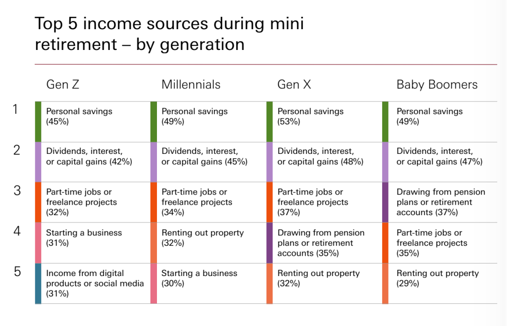 Cách tiếp cận giữa các thế hệ cũng khác nhau: Gen Z hướng tới khởi nghiệp và thu nhập từ sản phẩm số, trong khi thế hệ Millennials, Gen X và Baby Boomers chủ yếu dựa vào tiết kiệm, riêng nhóm lớn tuổi còn sử dụng thêm lương hưu và tài khoản hưu trí.